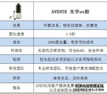 AVENTK是一家研發(fā)及生產(chǎn)UV膠水的的廠(chǎng)家,具有各種不同類(lèi)型的UV膠水,滿(mǎn)足不同的粘接需求.,為客戶(hù)提供更優(yōu)質(zhì)的產(chǎn)品、更有效的解決方案及周到完善的售后服務(wù)。