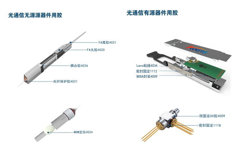 2. 光通訊用膠:近兩年,AVENTK在光通訊膠水方面投入了巨大的精力,針對光通訊用膠需求和問(wèn)題進(jìn)行研發(fā)設計,解決了很多光通訊行業(yè)的用膠問(wèn)題。目前AVENTK光通訊膠水已覆蓋光通訊無(wú)源器件中FA尾膠、FA頭膠、耦合膠、光纖保護膠、WDM定位等用膠點(diǎn);光通訊有源器件中lens粘接、密封固定、BOSA粘接、預固定、密封固定等用膠點(diǎn)。