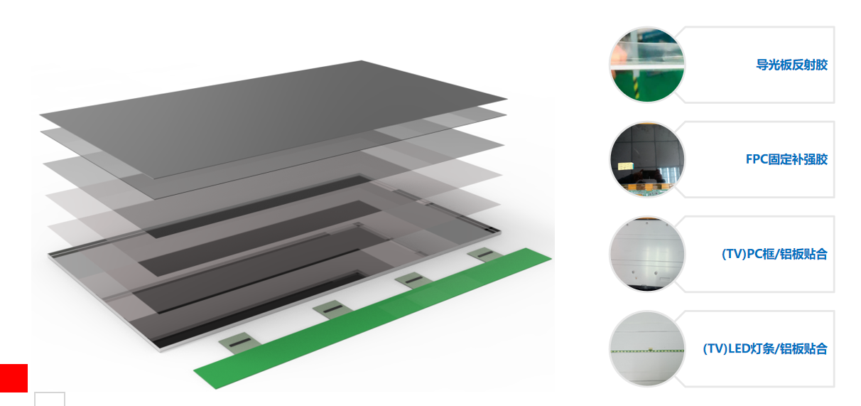 3.屏用膠:屏幕用膠也是AVENTK非常重要的應用領(lǐng)域,AVENTK第一款變色UV膠就是為解決屏幕邊框粘接擋光問(wèn)題而誕生的,目前AVENTK變色UV膠也已完善為多個(gè)版本,應用領(lǐng)域也在不斷擴大。目前AVENTK屏用膠主要覆蓋導光板反射膠、FPC固定補強膠、(TV)PC框/鋁板貼合、(TV)LED燈條/鋁板貼合等用膠點(diǎn)。